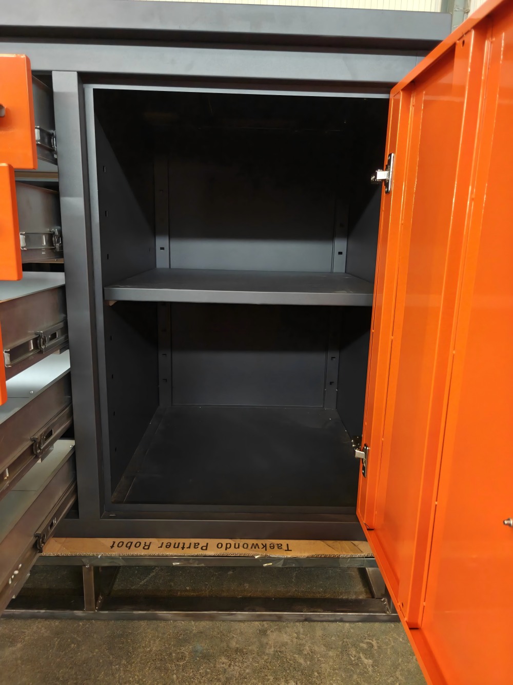 Orange Workbench е изработен от висококачествени стоманени табели със студено валц. Повърхността се обработва чрез автоматизиран електростатичен процес на пръскане, който е едновременно красив и издръжлив. Хоризонталните и вертикалните дялове в чекмеджето на оранжевата работна маса могат да бъдат свободно коригирани, за да поддържат разделянето на пространството според размера на елементите. Кутиите за части от типа на единица могат да бъдат избрани и за постигане на изискана класификация и съхранение. Релсите на чекмеджетата на оранжевата работна маса са проектирани с висококачествени лагери. Чекмеджето с еднократна песен има товарен капацитет от 80 кг и скорост на отваряне от 85%; Чекмеджето с двойна писта има товарен капацитет от 140 кг и скорост на отваряне от 100%и е гъвкав и гладък за натискане и издърпване.